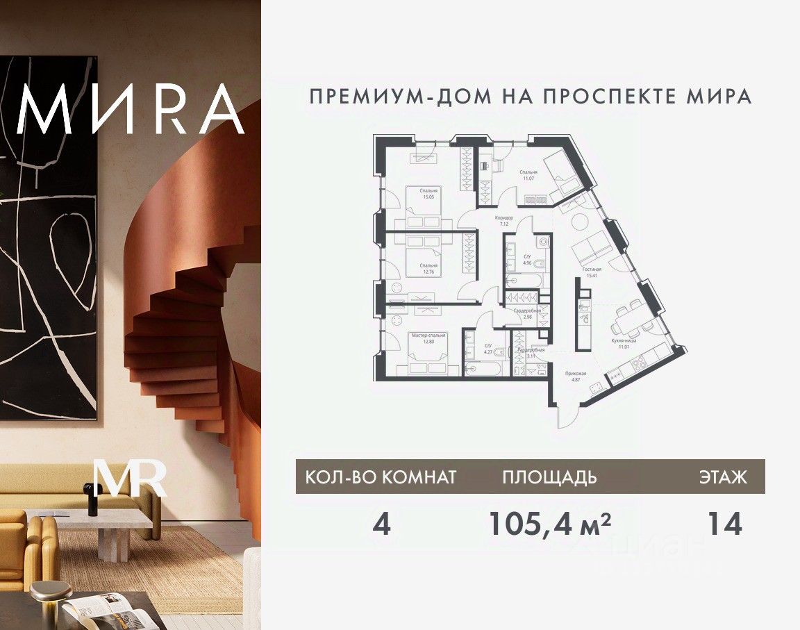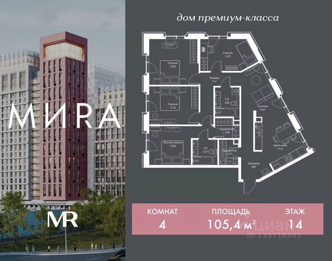 Продаётся 4-комнатная квартира общей площадью 105.41 м² без отделки в доме премиум-класса МИRА на 14-м этаже 23 этажного дома. Квартира расположена в корпусе 2.