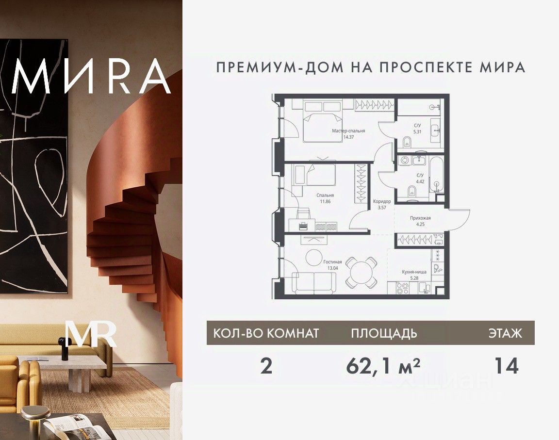 Продаётся 2-комнатная квартира общей площадью 62.10 м² без отделки в доме премиум-класса МИRА на 14-м этаже 23 этажного дома. Квартира расположена в корпусе 2.