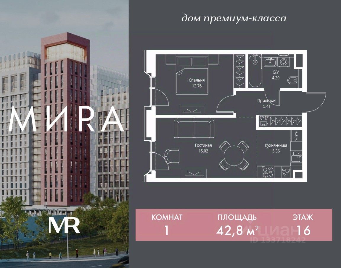 Продаётся 1-комнатная квартира общей площадью 42.84 м² без отделки в доме премиум-класса МИRА на 16-м этаже 23 этажного дома. Квартира расположена в корпусе 2.