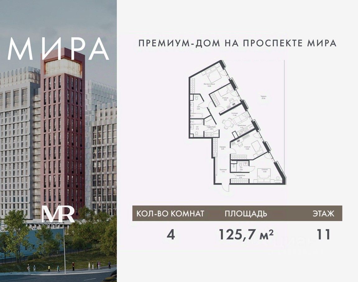 Продаётся 4-комнатная квартира общей площадью 125.74 м² без отделки в доме премиум-класса МИРА на 11-м этаже 23 этажного дома. Квартира расположена в корпусе 2.