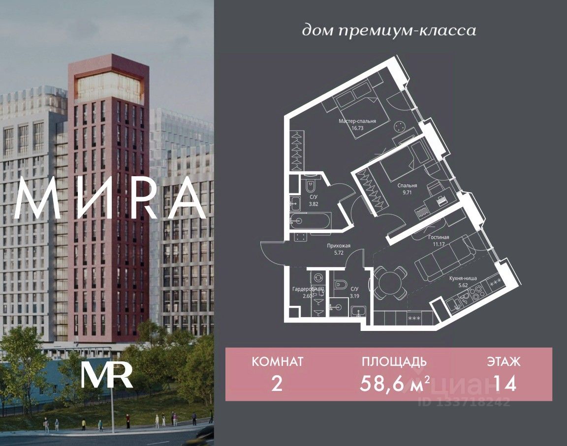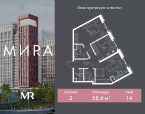 Продаётся 2-комнатная квартира общей площадью 58.56 м² без отделки в доме премиум-класса МИRА на 14-м этаже 23 этажного дома. Квартира расположена в корпусе 2.