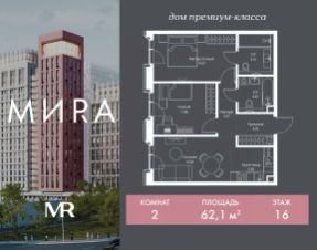 Продаётся 2-комнатная квартира общей площадью 62.10 м² без отделки в доме премиум-класса МИRА на 16-м этаже 23 этажного дома. Квартира расположена в корпусе 2.