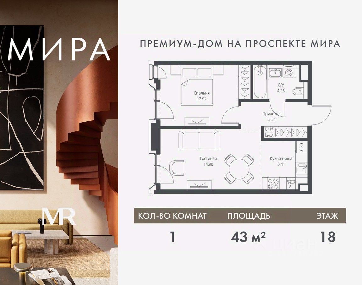 Продаётся 1-комнатная квартира общей площадью 43 м² без отделки в доме премиум-класса МИРА на 18-м этаже 23 этажного дома. Квартира расположена в корпусе 2.
