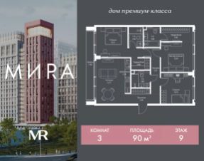 Продаётся 3-комнатная квартира общей площадью 90.03 м² без отделки в доме премиум-класса МИRА на 9-м этаже 23 этажного дома. Квартира расположена в корпусе 2.