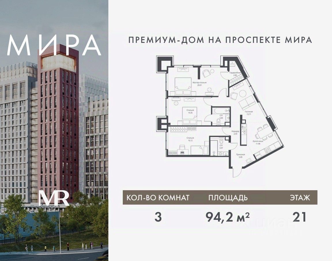 Продаётся 3-комнатная квартира общей площадью 94.20 м² без отделки в доме премиум-класса МИРА на 21-м этаже 23 этажного дома. Квартира расположена в корпусе 2.