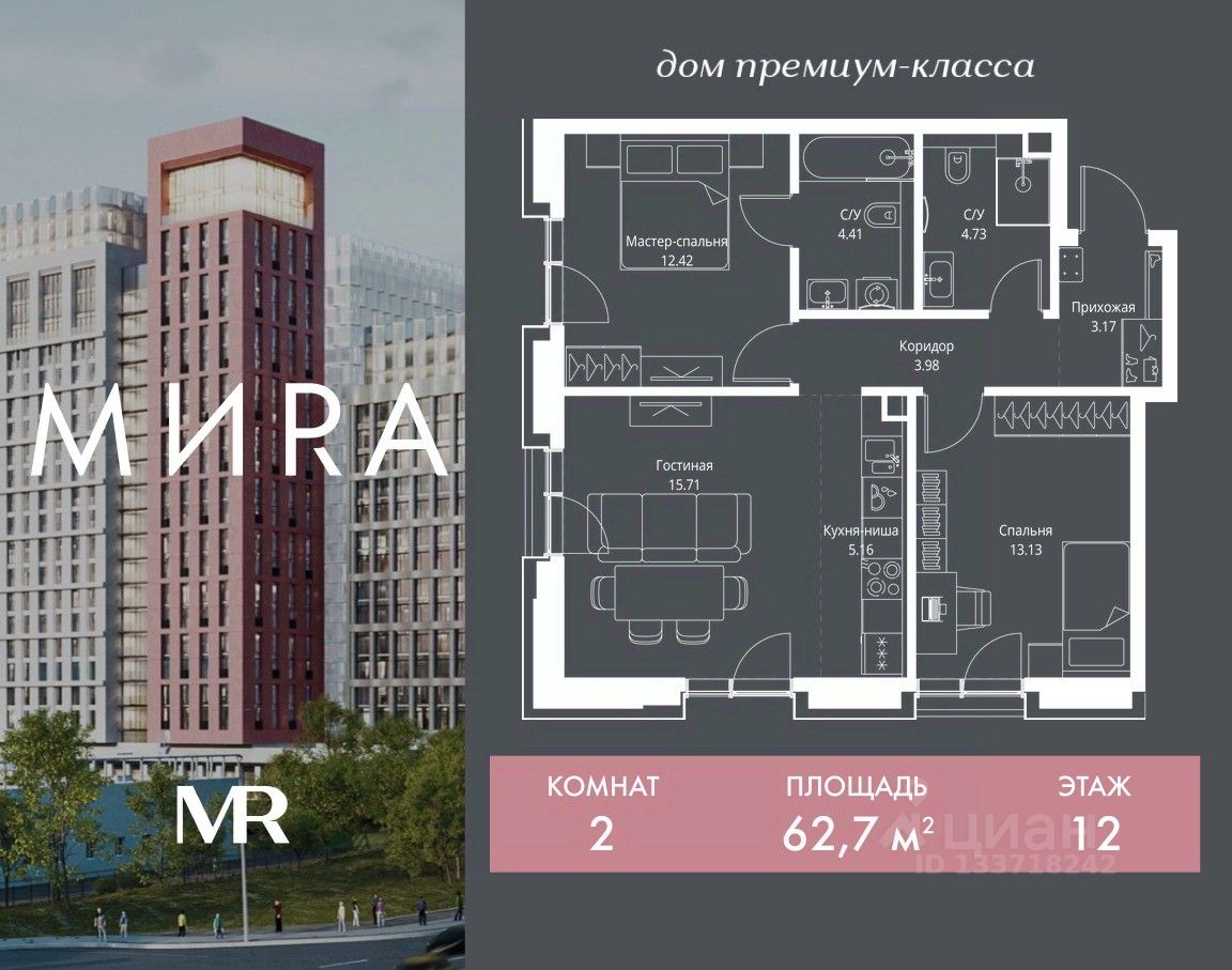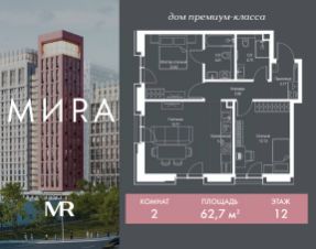Продаётся 2-комнатная квартира общей площадью 62.71 м² без отделки в доме премиум-класса МИRА на 12-м этаже 23 этажного дома. Квартира расположена в корпусе 2.