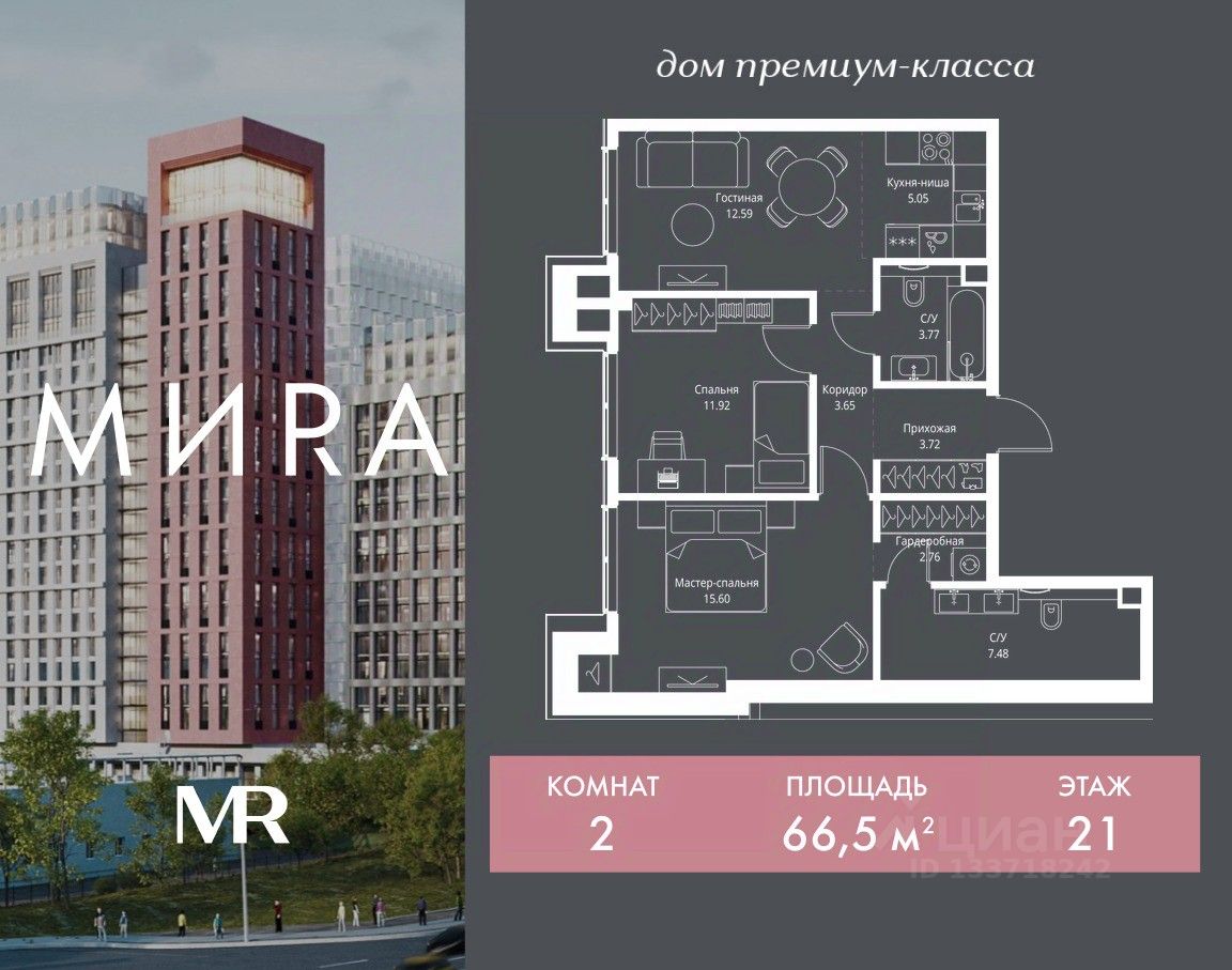 Продаётся 2-комнатная квартира общей площадью 66.54 м² без отделки в доме премиум-класса МИRА на 21-м этаже 23 этажного дома. Квартира расположена в корпусе 2.