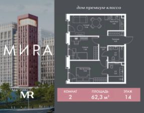 Продаётся 2-комнатная квартира общей площадью 62.29 м² без отделки в доме премиум-класса МИRА на 14-м этаже 23 этажного дома. Квартира расположена в корпусе 2.