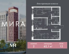 Продаётся 2-комнатная квартира общей площадью 62.10 м² без отделки в доме премиум-класса МИRА на 12-м этаже 23 этажного дома. Квартира расположена в корпусе 2.