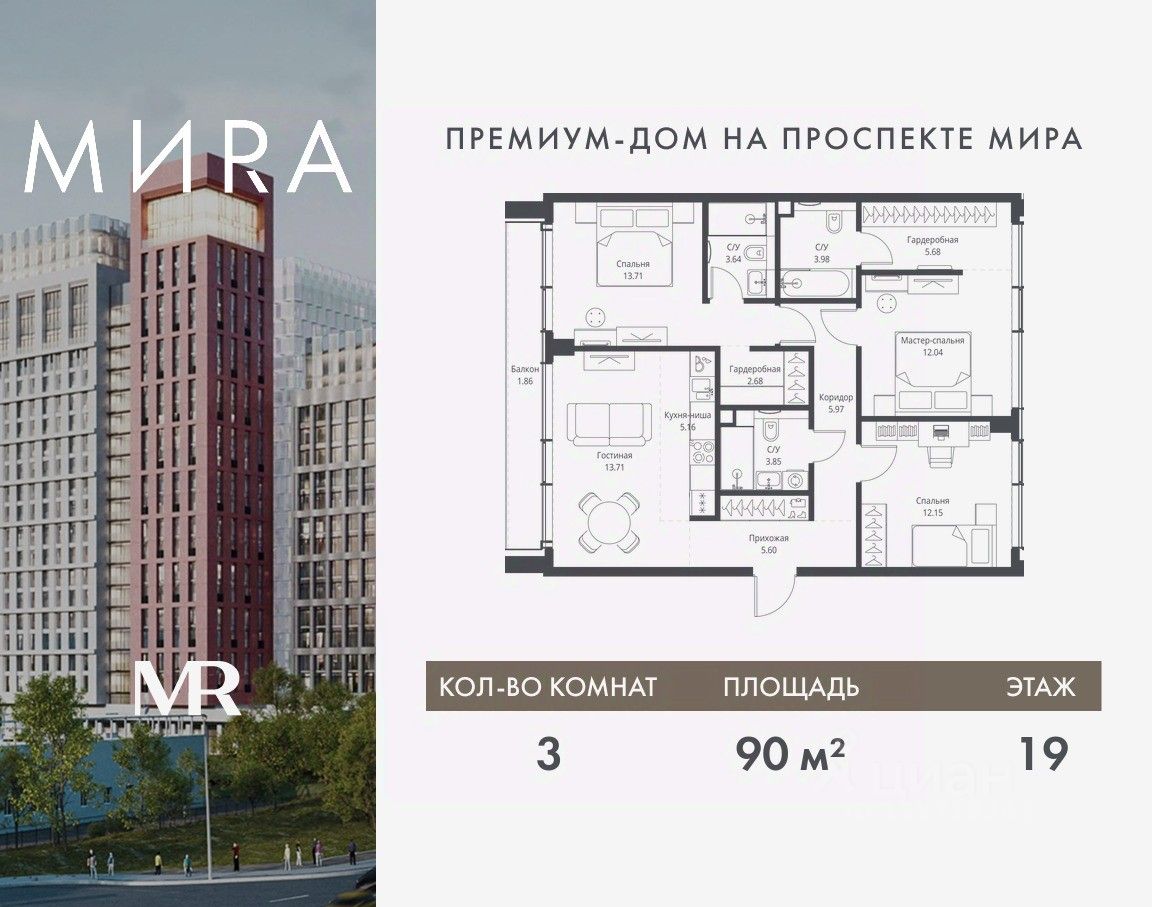 Продаётся 3-комнатная квартира общей площадью 90.03 м² без отделки в доме премиум-класса МИRА на 19-м этаже 23 этажного дома. Квартира расположена в корпусе 2.