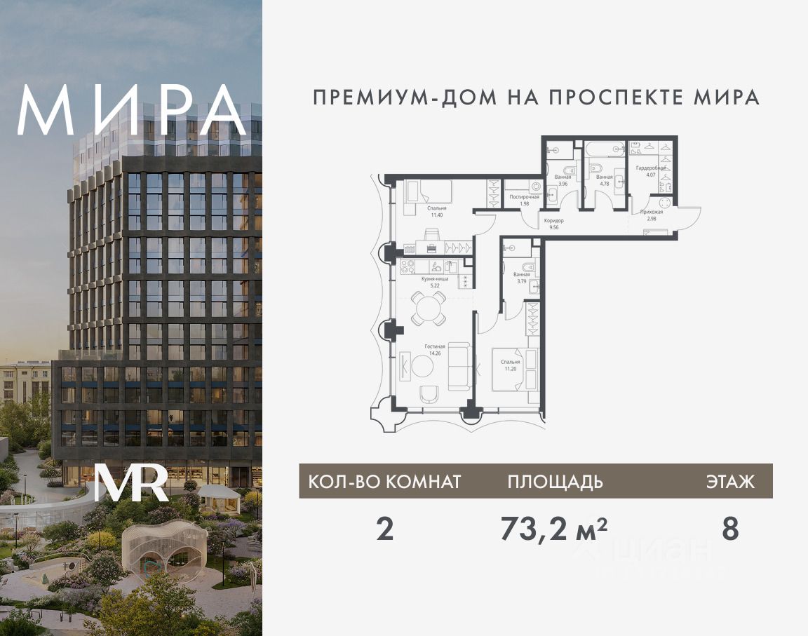 Продаётся 2-комнатная квартира общей площадью 73.20 м² без отделки в доме премиум-класса МИРА на 8-м этаже 17 этажного дома. Квартира расположена в корпусе 1.