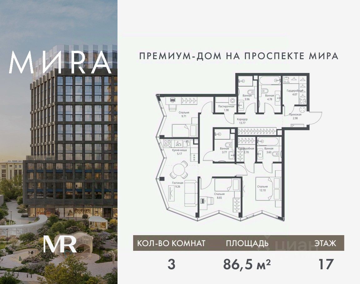 Продаётся 3-комнатная квартира общей площадью 86.50 м² без отделки в доме премиум-класса МИRА на 17-м этаже 17 этажного дома. Квартира расположена в корпусе 1.