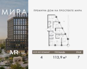 Продаётся 4-комнатная квартира общей площадью 113.94 м² без отделки в доме премиум-класса МИRА на 7-м этаже 17 этажного дома. Квартира расположена в корпусе 1.