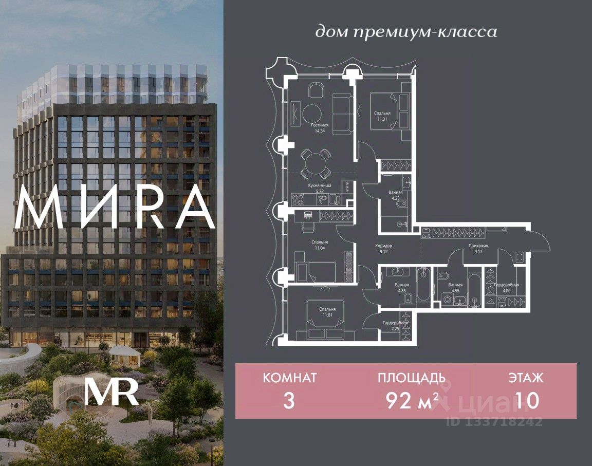 Продаётся 3-комнатная квартира общей площадью 91.95 м² без отделки в доме премиум-класса МИRА на 10-м этаже 17 этажного дома. Квартира расположена в корпусе 1.