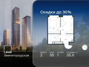 В жилом квартале продаётся 1-комнатная квартира площадью 35.60 кв.м без отделки. Квартира расположена на 35 этаже 64 этажного корпуса 2 в жилом комплексе комфорт класса Level Звенигородская (компания Level Group/Левел групп).