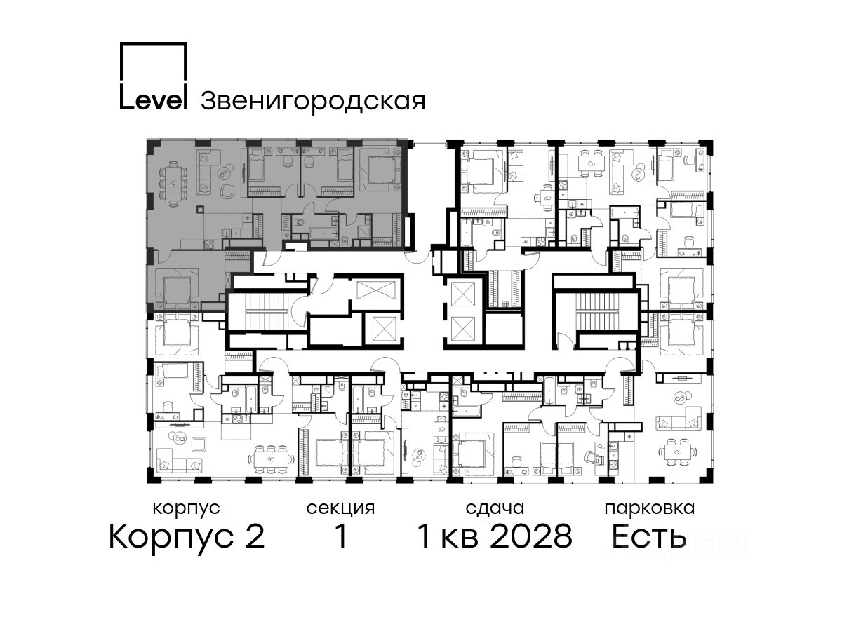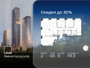 В жилом квартале продаётся многокомнатная квартира площадью 119.30 кв.м без отделки. Квартира расположена на 63 этаже 64 этажного корпуса 2 в жилом комплексе комфорт класса Level Звенигородская (компания Level Group/Левел групп).