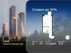 В жилом квартале продаётся студия площадью 17.40 кв.м без отделки. Квартира расположена на 19 этаже 64 этажного корпуса 2 в жилом комплексе комфорт класса Level Звенигородская (компания Level Group/Левел групп).
