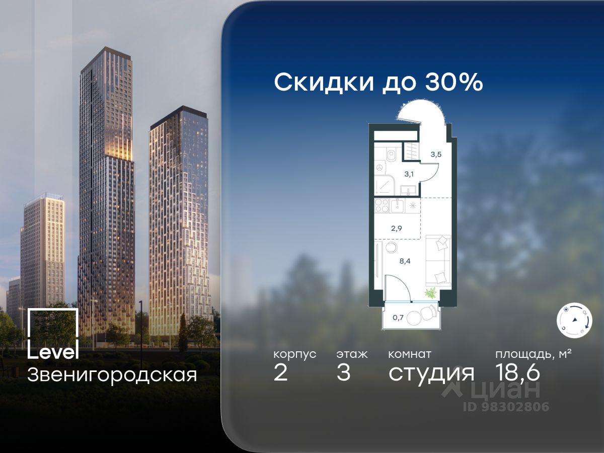 В жилом квартале продаётся студия площадью 18.60 кв.м без отделки. Квартира расположена на 3 этаже 64 этажного корпуса 2 в жилом комплексе комфорт класса Level Звенигородская (компания Level Group/Левел групп).