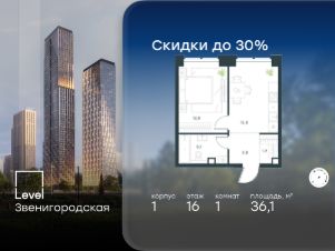 В жилом квартале продаётся 1-комнатная квартира площадью 36.10 кв.м white box. Квартира расположена на 16 этаже 48 этажного корпуса 1 в жилом комплексе комфорт класса Level Звенигородская (компания Level Group/Левел групп).