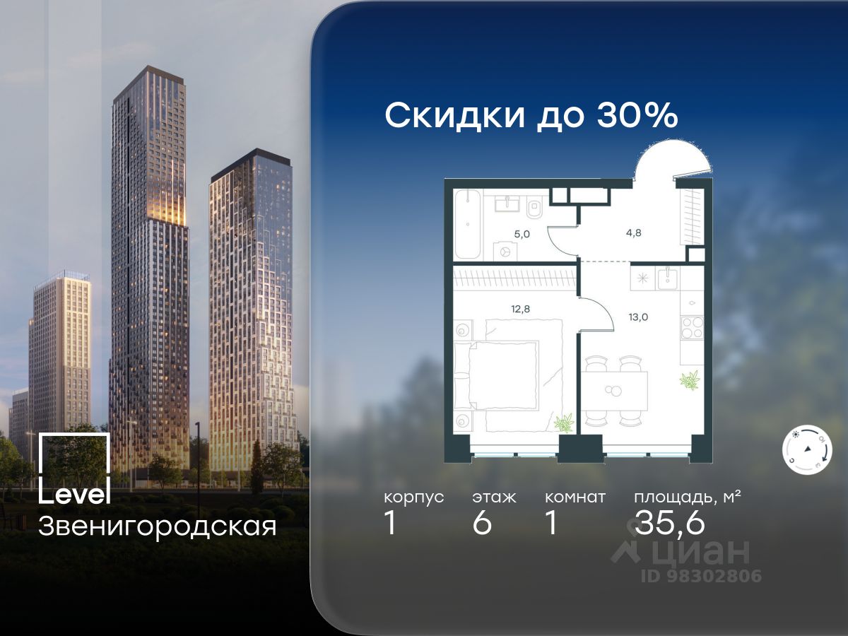 В жилом квартале продаётся 1-комнатная квартира площадью 35.60 кв.м white box. Квартира расположена на 6 этаже 48 этажного корпуса 1 в жилом комплексе комфорт класса Level Звенигородская (компания Level Group/Левел групп).