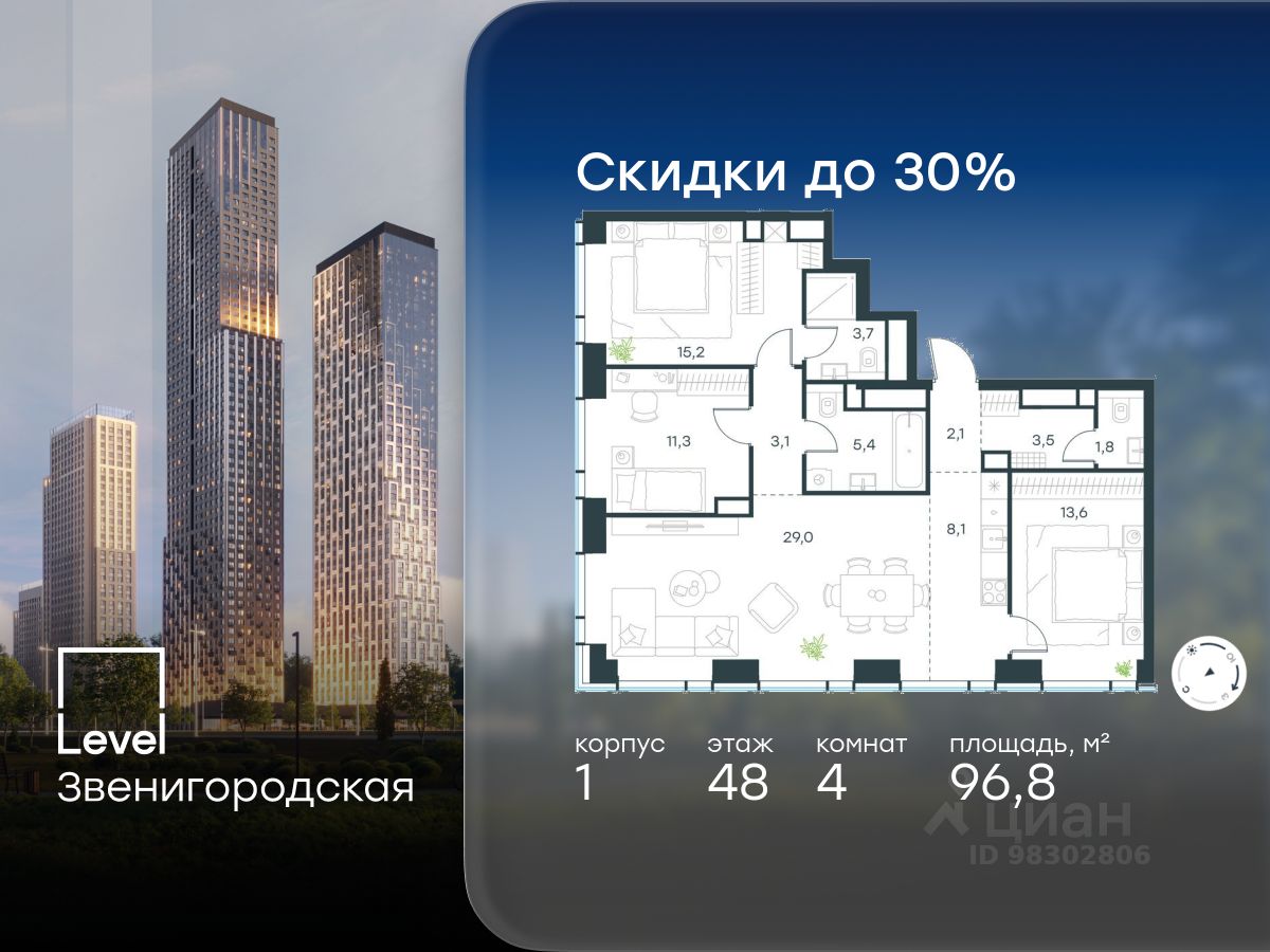 В жилом квартале продаётся 4-комнатная квартира площадью 96.80 кв.м white box. Квартира расположена на 48 этаже 48 этажного корпуса 1 в жилом комплексе комфорт класса Level Звенигородская (компания Level Group/Левел групп).