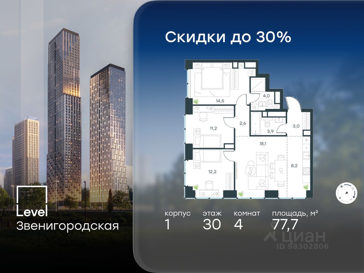 В жилом квартале продаётся 4-комнатная квартира площадью 77.70 кв.м white box. Квартира расположена на 30 этаже 48 этажного корпуса 1 в жилом комплексе комфорт класса Level Звенигородская (компания Level Group/Левел групп).