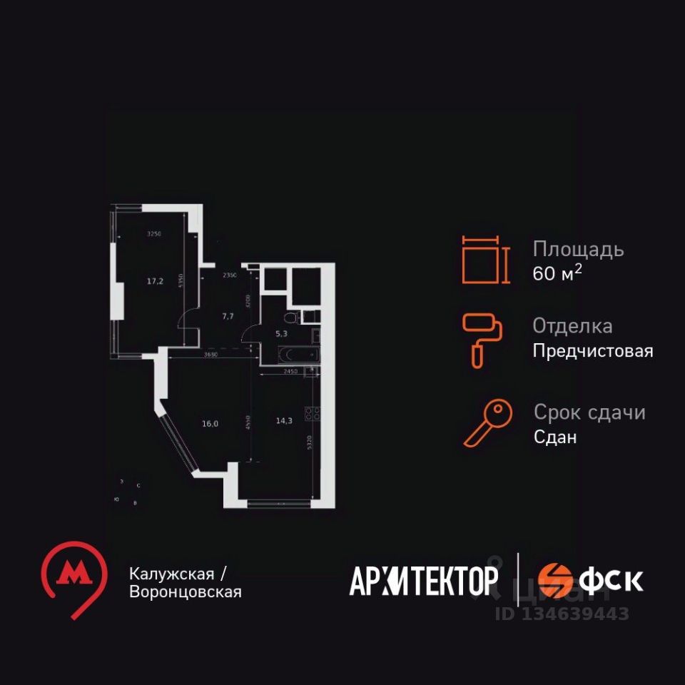 Продаётся 2-к квартира номер 1007 общей площадью 60.5 кв.м. на 34-м этаже 47 этажного здания. Отделка Whitebox. Цена с учётом скидки.