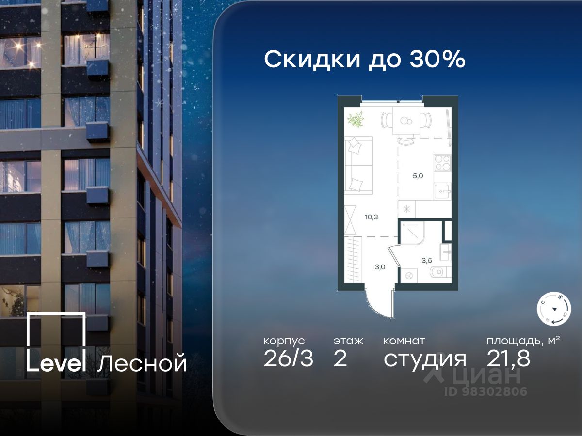 В районе, утопающем в густой зелени лесов, многочисленных парков и скверов, продаётся студия площадью 21.80 кв.м без отделки. Квартира расположена на 2 этаже в жилом комплексе комфорт-класса Level Лесной (компания Level Group/Левел групп).
