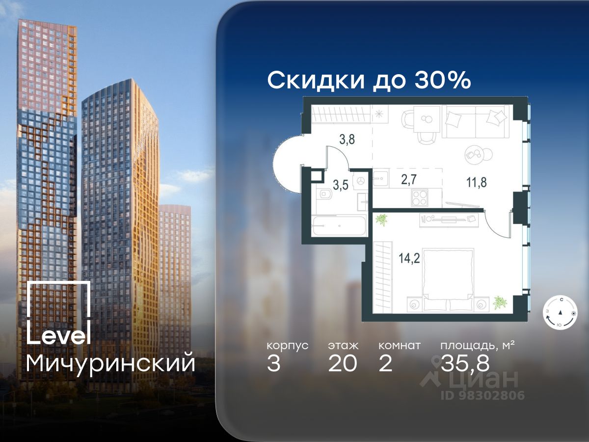 В жилом квартале, расположенном на границе с природным заказником "Долина реки Очаковки", продаётся 2-комнатная квартира площадью 35.80 кв.м с отделкой white box. Квартира расположена на 20 этаже 30-этажного корпуса 3 в жилом комплексе бизнес-класса Level Мичуринский (компания Level Group/Левел групп).