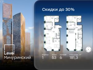 В жилом квартале, расположенном на границе с природным заказником "Долина реки Очаковки", продаётся многокомнатная квартира площадью 181.30 кв.м без отделки. Квартира расположена на 53 этаже 54-этажного корпуса 1 в жилом комплексе бизнес-класса Level Мичуринский (компания Level Group/Левел групп).