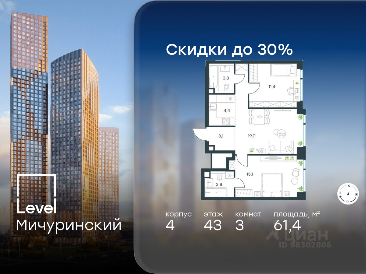 В жилом квартале, расположенном на границе с природным заказником "Долина реки Очаковки", продаётся 3-комнатная квартира площадью 61.40 кв.м без отделки. Квартира расположена на 43 этаже 45-этажного корпуса 4 в жилом комплексе бизнес-класса Level Мичуринский (компания Level Group/Левел групп).