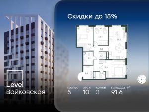 Продается 3-комнатная квартира площадью 91.60 кв. м без отделки. Квартира находится на 10 этаже 20-этажного корпуса 5, в новом жилом комплексе бизнес-класса Level Войковская, расположенном рядом с живописным заповедником "Покровское-Стрешнево" (застройщик - компания Level Group/Левел групп).