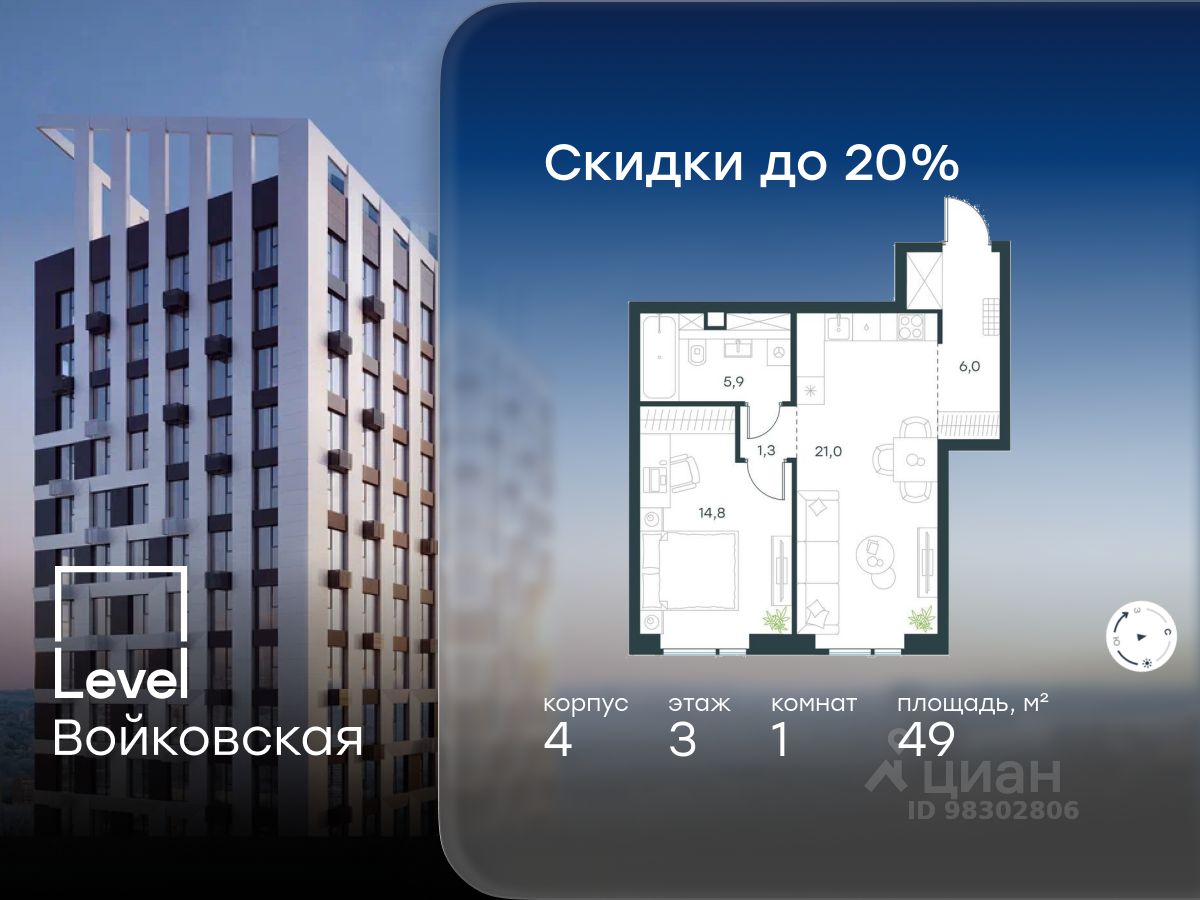 Продается 1-комнатная квартира площадью 49.00 кв. м с отделкой. Квартира находится на 3 этаже 26-этажного корпуса 4, в новом жилом комплексе бизнес-класса Level Войковская, расположенном рядом с живописным заповедником "Покровское-Стрешнево" (застройщик - компания Level Group/Левел групп).