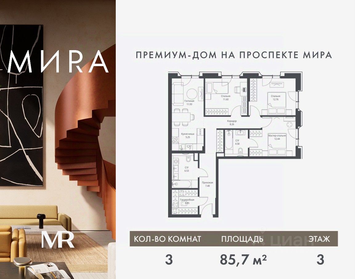 Продаётся 3-комнатная квартира общей площадью 85.68 м² без отделки в доме премиум-класса МИRА на 3-м этаже 23 этажного дома. Квартира расположена в корпусе 2.