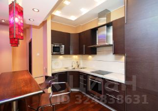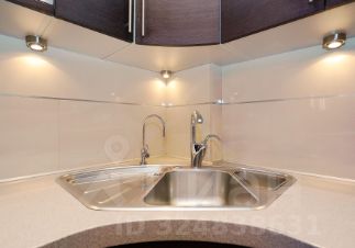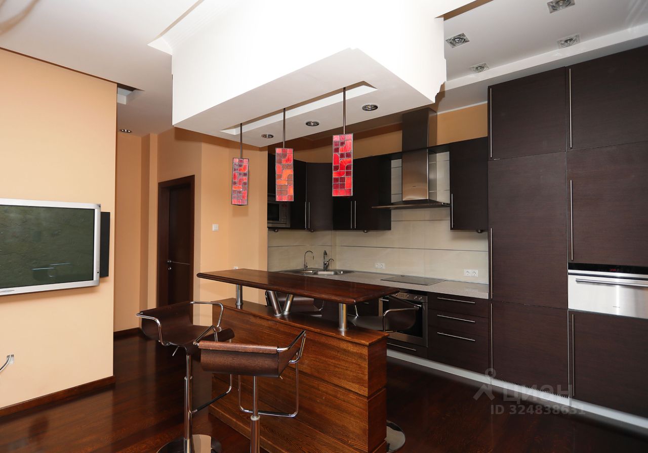 Кухонная зона оснащена встроенной техникой премиум-класса Miele, Siemens, Neff, включая встроенную пароварку и посудомоечную машину. Пространство объединено с гостиной и визуально зонируется за счёт барной стойки из массива дерева и системы освещения.