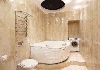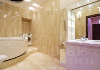 Основной санузел выполнен в светлых тонах, оборудован гидромассажной ванной Jacuzzi объёмом 570 литров, потолочной подсветкой "звёздное небо" и системой автоматического перекрытия воды при протечке.