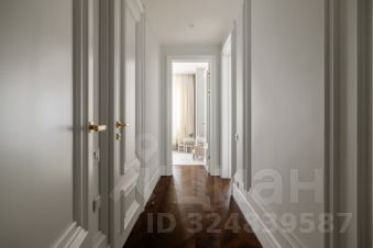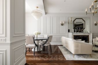 Интерьер оформлен в классическом стиле с использованием натуральных материалов — натурального мрамора, оникса, керамогранита, кварца и дерева. Стены украшают декоративные молдинги и карнизы, на полу выложена паркетная доска из дуба в форме французской елки.