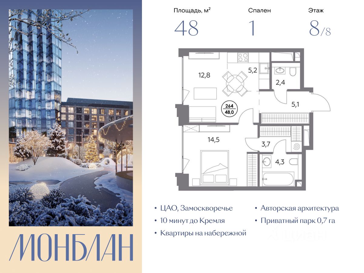В элитном жилом комплексе "Монблан" на Шлюзовой набережной в Замоскворечье напрямую от девелопера ГК "Галс-Девелопмент" представлена 1-комнатная квартира квартира на 8 этаже общей площадью 48.00 м².