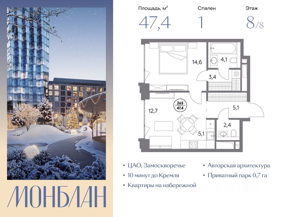 В элитном жилом комплексе "Монблан" на Шлюзовой набережной в Замоскворечье напрямую от девелопера ГК "Галс-Девелопмент" представлена 1-комнатная квартира квартира на 8 этаже общей площадью 47.40 м².