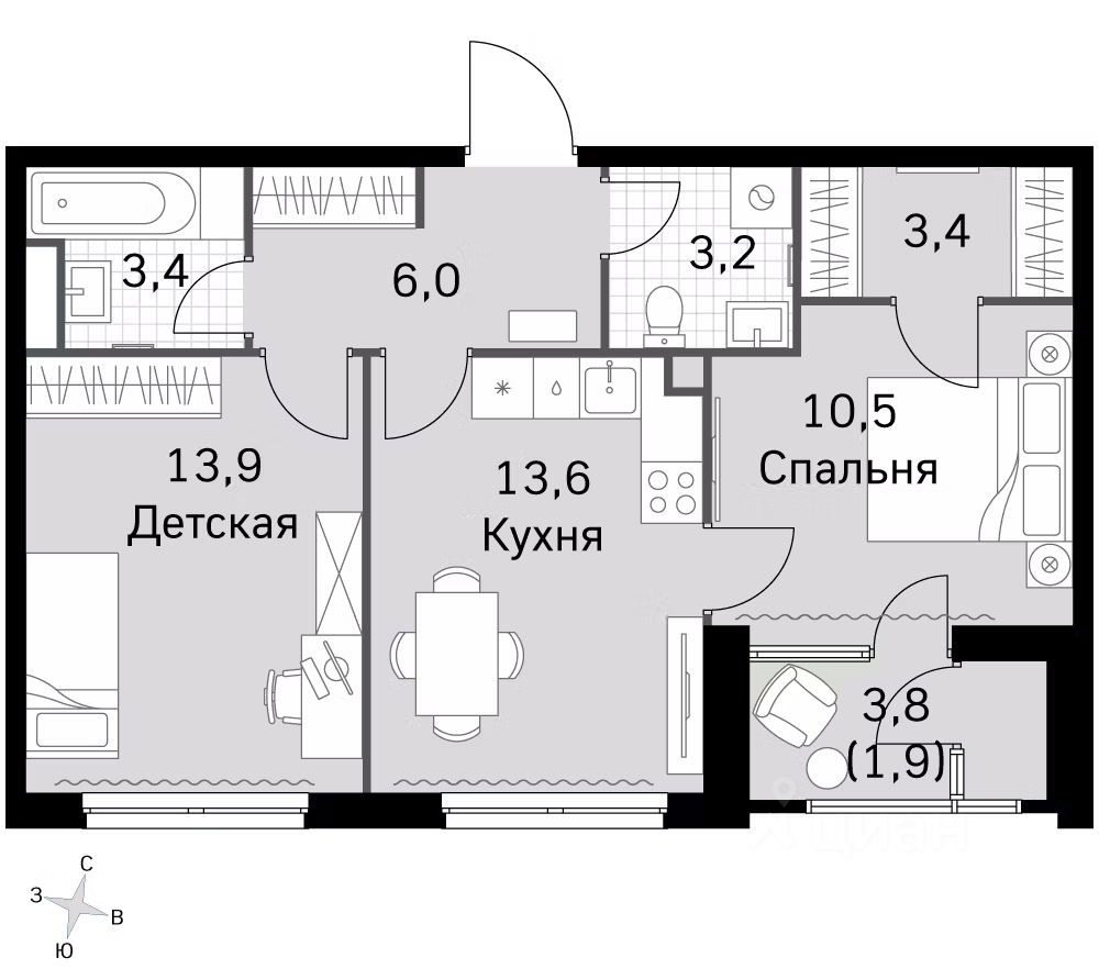 О КВАРТИРЕ: 1 - й КОРПУС, секция 4. Просторная 2-х комнатная квартира общей площадью 55,9 кв. метров состоит из просторной кухни гостиной площадью 13, 6 кв. метров и двух спальных комнат 13,9 кв. и 10,5 кв. метров. Отделка WHIiTE BOX. В наличии два совмещенных санузла. Высота потолков 3 метра. В квартире много света за счет широкоформатных окон, выходящих во благоустроенный двор.