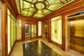В нижней части жилого корпуса находится вестибюль с оригинальным витражным остеклением.