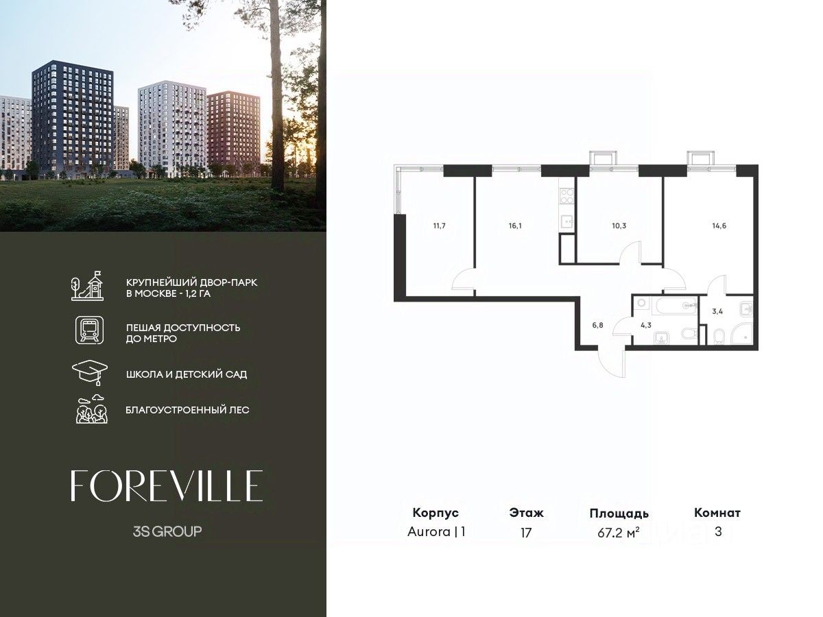 Продается уютная 3-комн. квартира площадью 67,2 кв.м на 17 этаже 17 этажного жилого комплекса бизнес-класса Foreville от 3S Group.