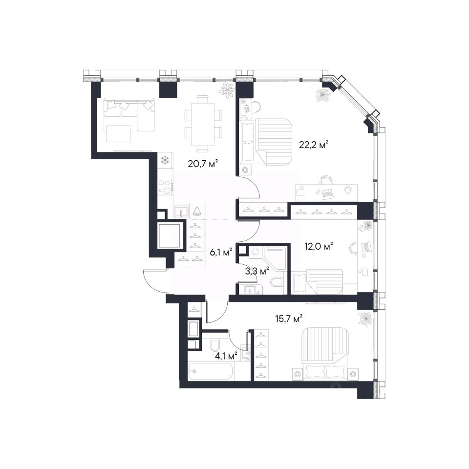 Продаётся 3-комнатная квартира площадью 84,1 м², расположенная на 19 этаже корпуса 2,1.