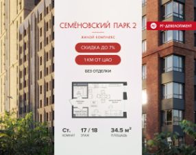 Продается студия 34,5 кв.м. в ЖК "Семеновский парк 2" на 17-м этаже 18 этажного дома.