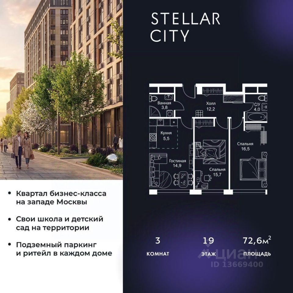 Продается квартира от надежного застройщика Tashir Estate в квартале бизнес-класса Stellar City в ЗАО Москвы.