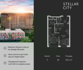 Продается квартира от надежного застройщика Tashir Estate в квартале бизнес-класса Stellar City в ЗАО Москвы. Площадь квартиры составляет: 46.1 кв. м, потолки: 3.1 м Квартира находится на 16 этаже, 4 корпуса жилого квартала Stellar City — микрогорода будущего на орбите Москвы. Stellar City — квартал в ЗАО Москвы вблизи инновационного центра Сколково. В окружении — 11 парков и природных зон, в том числе Долина реки Сетунь, Мещерский лес и парк развлечений The Rink. Город в городе Чтобы дом и инфраструктура вокруг отвечала динамичному лайфстайлу жителя мегаполиса, в основу проекта легла концепция город в городе, которая позволяет решать все бытовые вопросы in-home. В квартале будут возведены школа и детский сад, воркаут-зоны, променад, вело и беговые дорожки, детские площадки для каждого корпуса, а также коммерция на первых этажах для ежедневных покупок. Все необходимое — на расстоянии нескольких шагов. Изящные и лаконичные лобби Авторский дизайн, натуральные материалы в отделке и безупречный интерьер вне времени. Лобби и холлы в проекте бизнес-класса Stellar City ничем не отличаются от входных групп в премиум-сегменте благодаря качественным европейским материалам в отделке, стильному дизайну, консьерж-сервису и уютной зоне ожидания с журнальными столиками и мягкой мебелью. Комфорт и безопасность Закрытая территория, охрана, система СКУД, специально разработанное мобильное приложение дома для резидентов и подземный паркинг с круглосуточным наблюдением и доступом с помощью автоматического считывания номера авто.