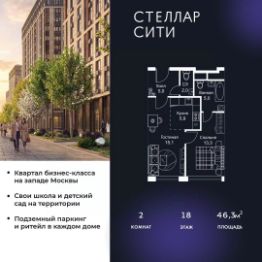 Квартира находится на 18 этаже, 4 корпуса жилого квартала Stellar City — микрогорода будущего на орбите Москвы.