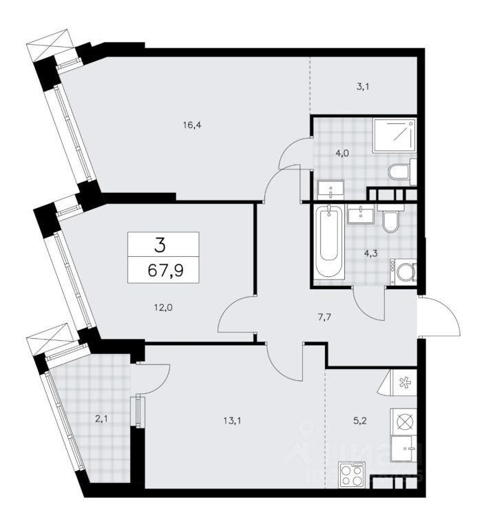 Площадь квартиры 68 кв.м. Это светлая трехкомнатная евро-планировка с отдельными спальнями и лоджией из гостиной. Из окон открывается живописный вид на реку и город.