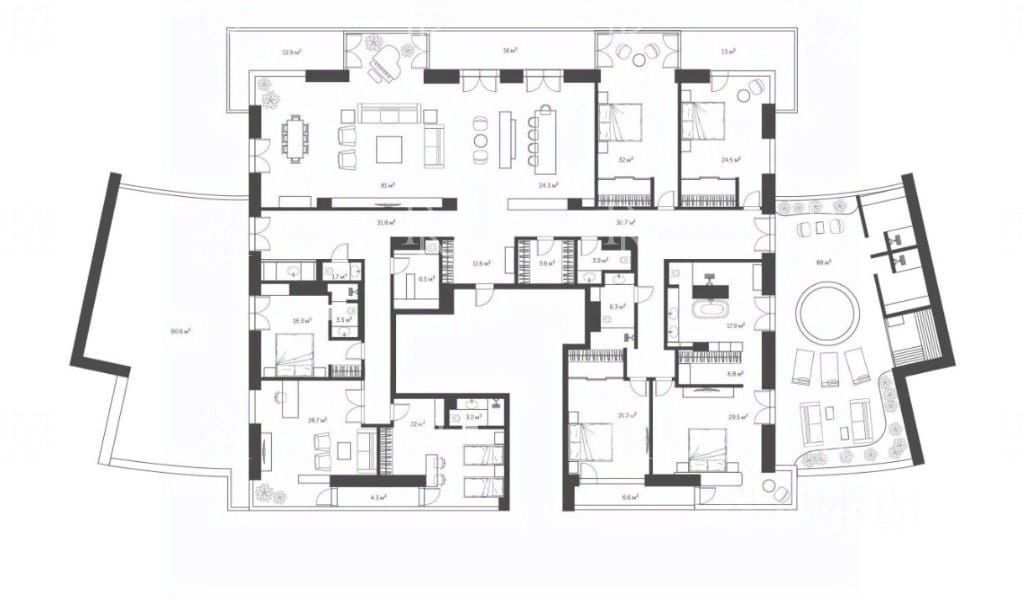 • Планировочное решение: видовая кухня-гостиная со столовой зоной, 5 мастер-спален с гардеробными и ванными комнатами, кабинет/гостевая, гостевой санузел, гардеробная при входе, холл, две открытые террасы по 90 м²