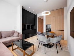 В отделке использованы натуральные материалы (камень, дерево твердых пород и пр.), премиальная сантехника, бытовая техника SМЕG.